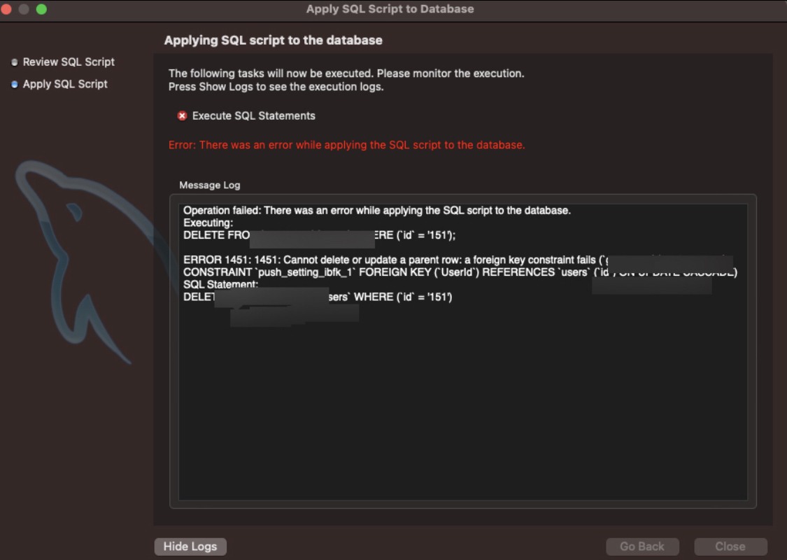 에러 메시지 : There was an error while applying the sql script to the database